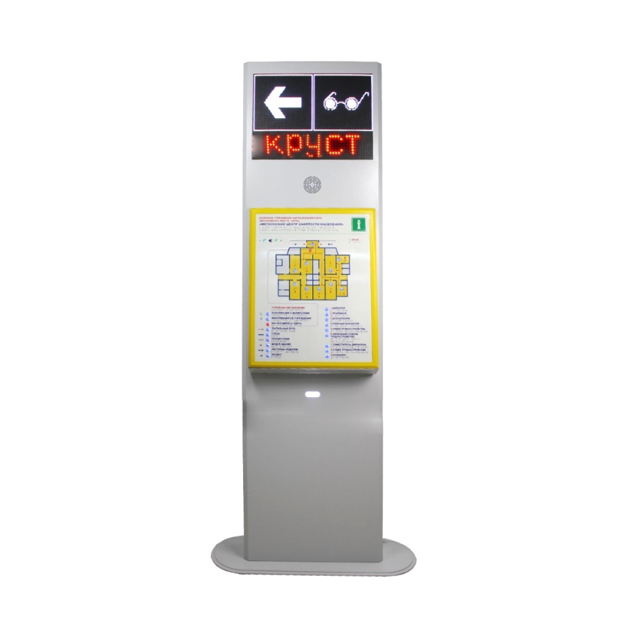 Степ-4 представляет собой металлическую стойку, покрытую порошковой краской, оснащенную бегущей строкой и тактильно-звуковой мнемосхемой. Бегущая строка позволит посетителям с нарушением слуха и ОДА получить свободный доступ ко всей необходимой информации.