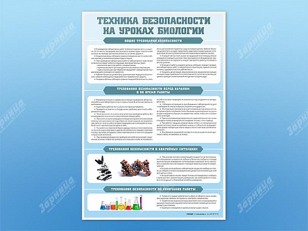 Стенд предназначен для ознакомления учащихся с безопасностью во время проведения лабораторных работ на занятиях по биологии. На стенде выделены четыре раздела: