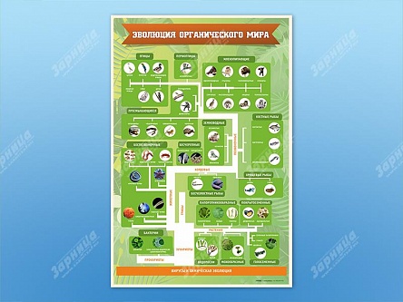Стенд представляет собой панель, на которой в виде схемы изображена эволюция живых существ, а также вирусы и химическая эволюция.