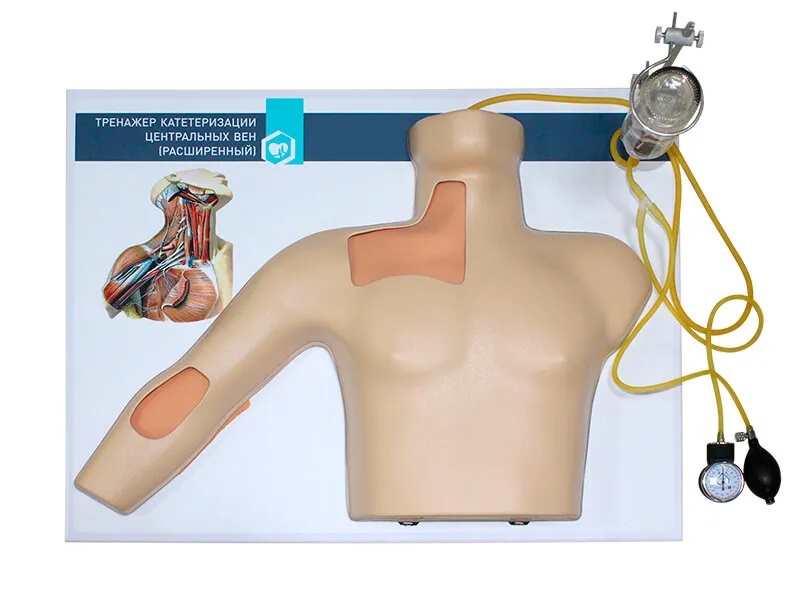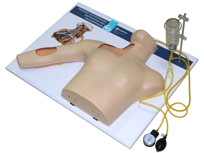 Тренажер катетеризации центральных вен Zarnitza - представляет анатомическую (костно-мышечно-кожную) модель верхней части торса человека и правой верхней конечности. Подбором материалов достигнуто соответствие механических характеристик воспроизведенных органов естественным значениям.