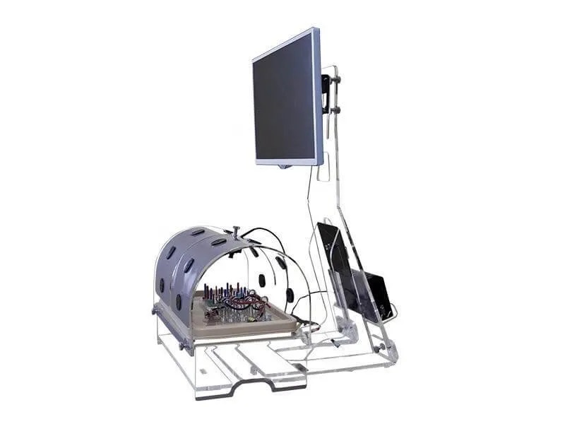 Стойка для монитора и коммутационного блока выполнена из прозрачного материала и снабжена кронштейном, позволяющим изменять высоту, угол поворота и наклона экрана размером не менее 24", а также снабжена портами для подключения цифровой камеры высокого разрешения и коммутационного блока. Коммутационный блок обеспечивает подключение монитора посредством порта HDMI, а также передачу изображения по протоколу SDI для возможности подключения дополнительных устройств воспроизведения видео. Запись производимых манипуляций, для дальнейшего разбора и анализа допущенных ошибок, осуществляется на USB-накопитель.