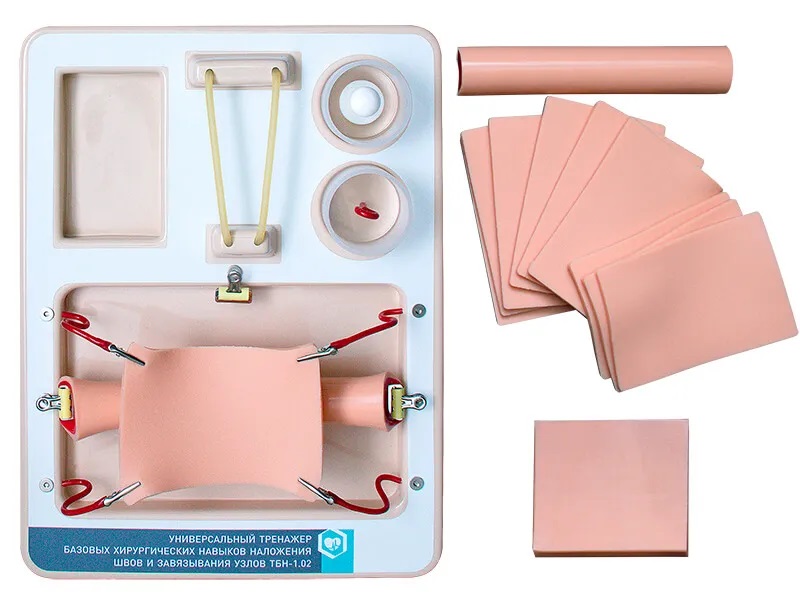 Комплектация | • Платформа с креплениями • Эластичные трубки для отработки правильного завязывания узла на тканях под натяжением • Крючок для завязывания узла • Цилиндрическое углубление для навыка работы в глубине • Устройство натяжения ткани • Пространство для универсальной фиксации тканей (в том числе зажимами-крокодилами и большими зажимными клипсами) • Муляж для подкожного шва • Ткань по наложению швов с фактурой кожного покрова (10 шт.) • Двухслойная модель кишки (2 шт.) |