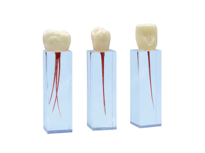 Комплект эндоблоков представляет собой набор из прозрачных прямоугольных блоков с корневыми каналами и размещенными на них коронками зубов. Каждому зубу: резец, премоляр, моляр, - соответствует определенное количество корневых каналов, характерное для анатомического строения зуба взрослого человека.