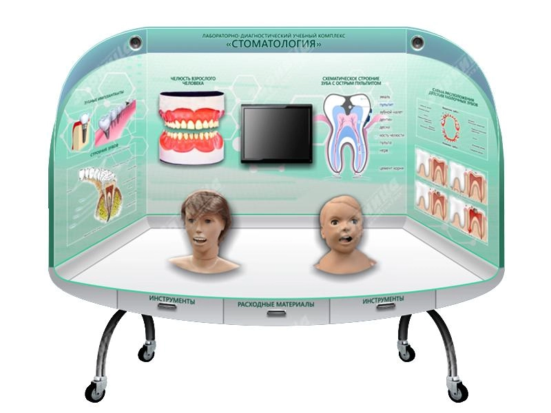 Учебное наглядно-демонстрационное обеспечение комплекса включает в себя светодинамические интерактивные стенды – панели, муляжи и фантомы, стоматологические инструменты и расходные материалы, а также моноблок с профильным программным обеспечением.