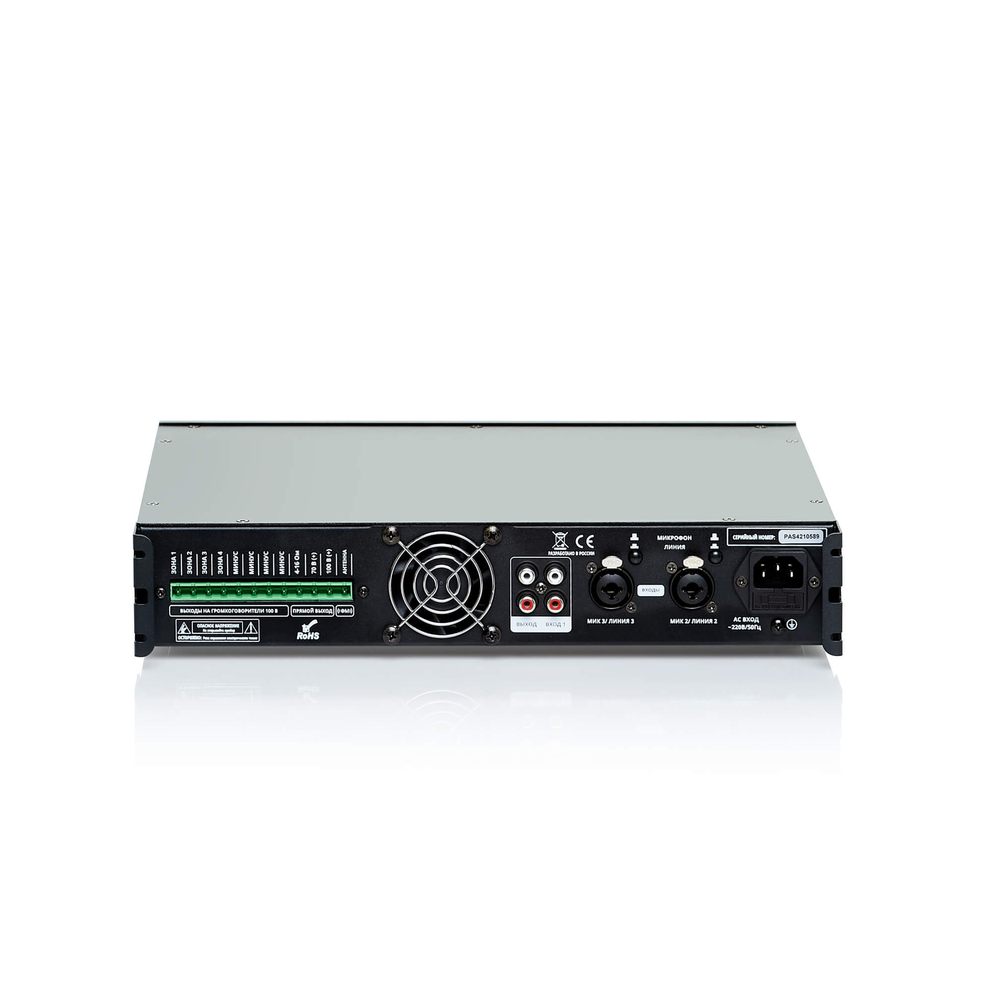 • Клеммы для подключения акустических систем 70/100В, 4-16 Ом и четырёх регулируемых зон