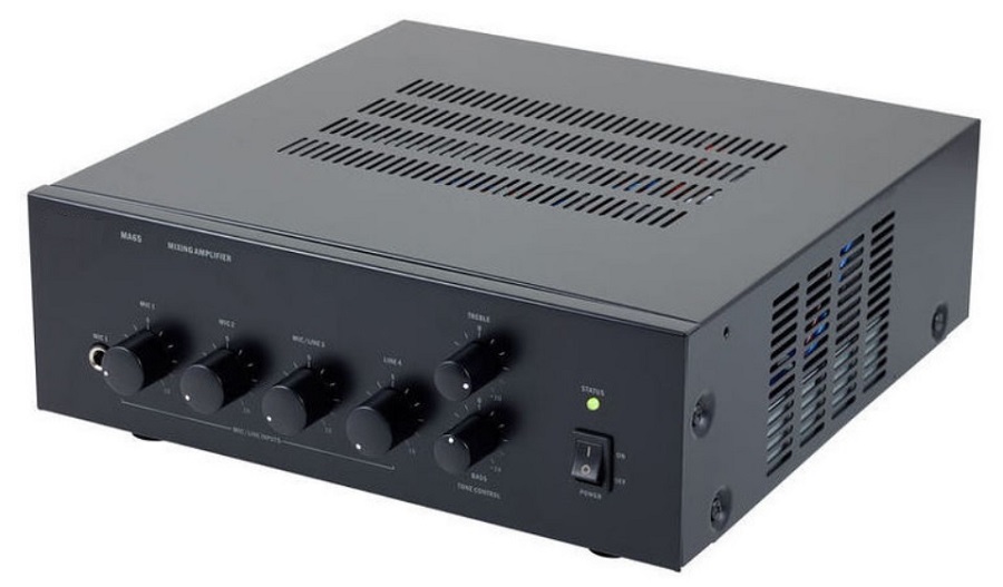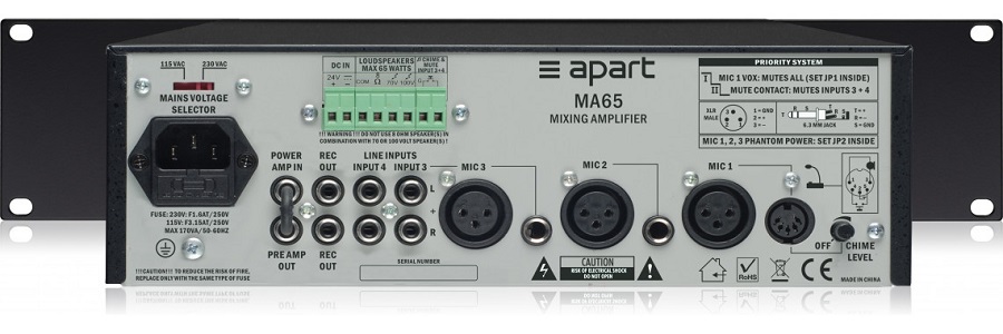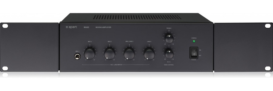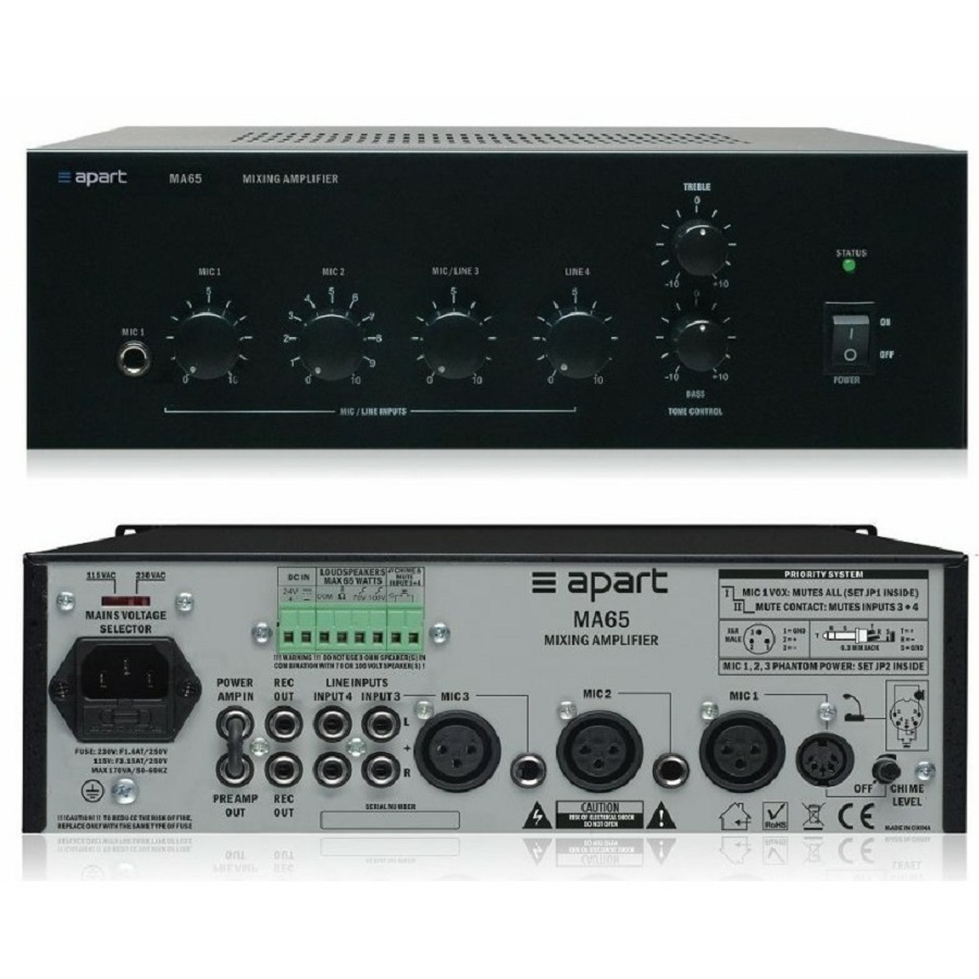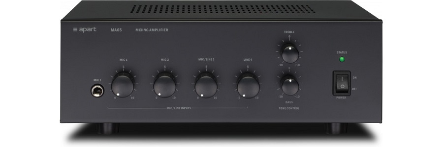 APart MA65 - компактный трансляционный микшер-усилитель мощностью 65 Вт. Имеет 2 микрофонных, 1 линейный и 1 универсальный линейный/микрофонный входы. Поставляется в настольном варианте. Опционально может комплектоваться металлическим адаптером для монтажа в стандартную 19" рэковую стойку APart MA35-19. Включение фантомного питания микрофонных линий осуществляется при помощи перемычки внутри корпуса усилителя. Усилитель может питаться от сети переменного тока ~230 В или источника постоянного тока 24 В.