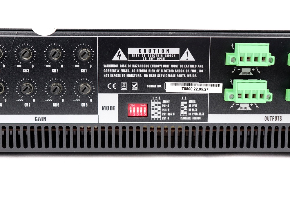 Профессиональные усилители мощности Artist T8800 оснащены импульсными блоками питания и усилителем класса D, сочетая высокую производительность с отличной энергоэффективностью, малой массой и хорошей стабильностью работы. Мощность каждого канала составляет 400 Вт на 8 Ом.