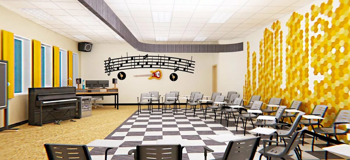 Помимо удобной мебели для учителя и учащихся, класс для изучения музыки должен иметь тематическое оформление. Нужно, чтобы с первых секунд было ясно, в какой именно кабинет пришли дети. Атмосфера сразу же настраивает на нужный лад, позволяет быстро переключиться на обучение творчеству.