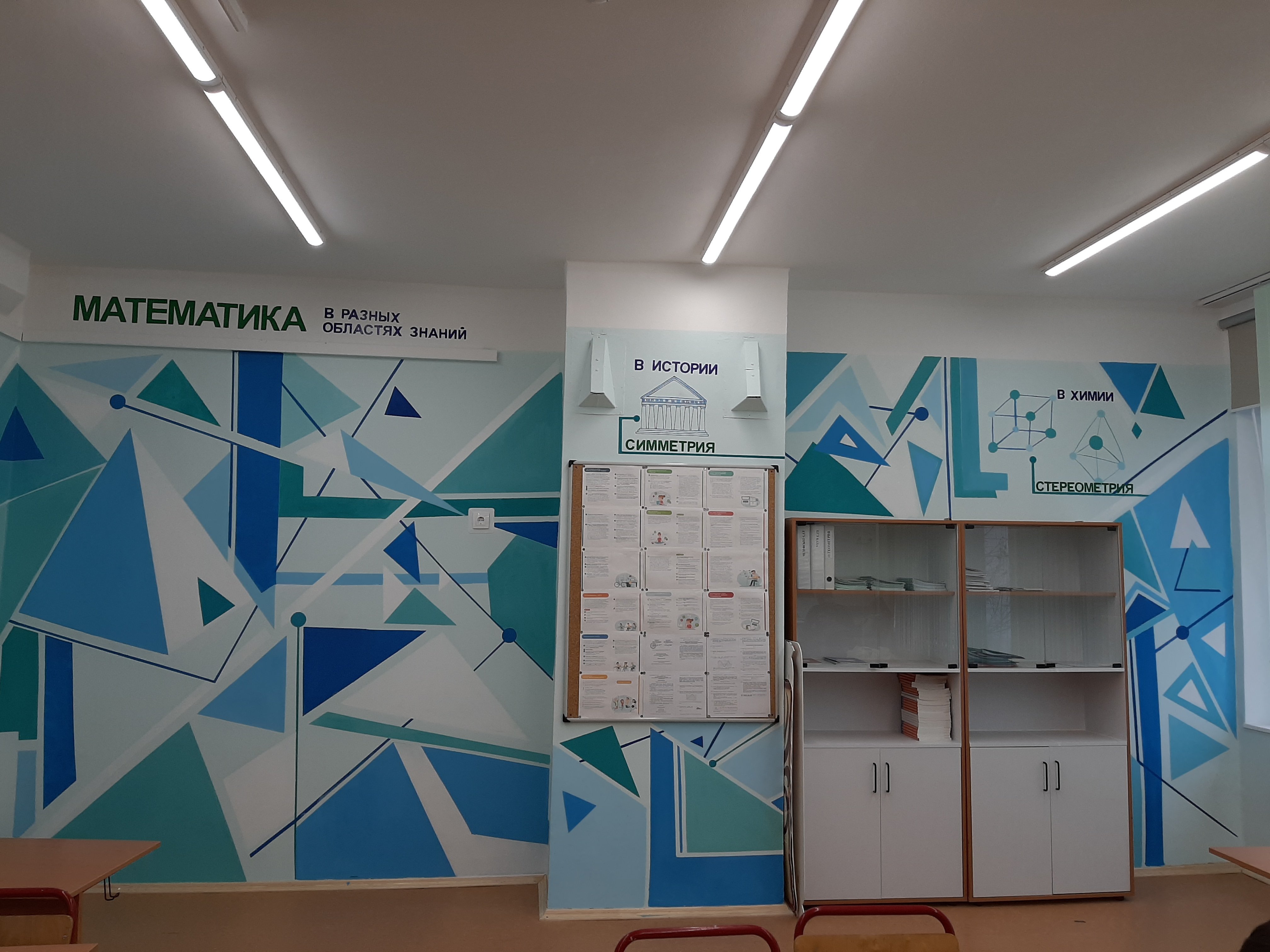 Для оформления кабинета математики предусмотрено создание учебно-методических экспозиций переменного и постоянного характера. Материалы экспозиций обновляются при переходе к изучению новой темы. Портреты выдающихся математиков и стенды размещены на стенах в виде постоянной композиции. Возле доски смонтированы держатели для крупногабаритных чертежных инструментов – линейки, транспортира, угольника. Для поддержания порядка в классе разнообразные наглядные пособия и обучающие материалы, которые не используются на текущем занятии, находятся в шкафах. Оборудование кабинета мультимедийным комплексом позволяет проводить уроки с применением современных образовательных технологий и осуществлять проектную деятельность с использованием информационных технологий.