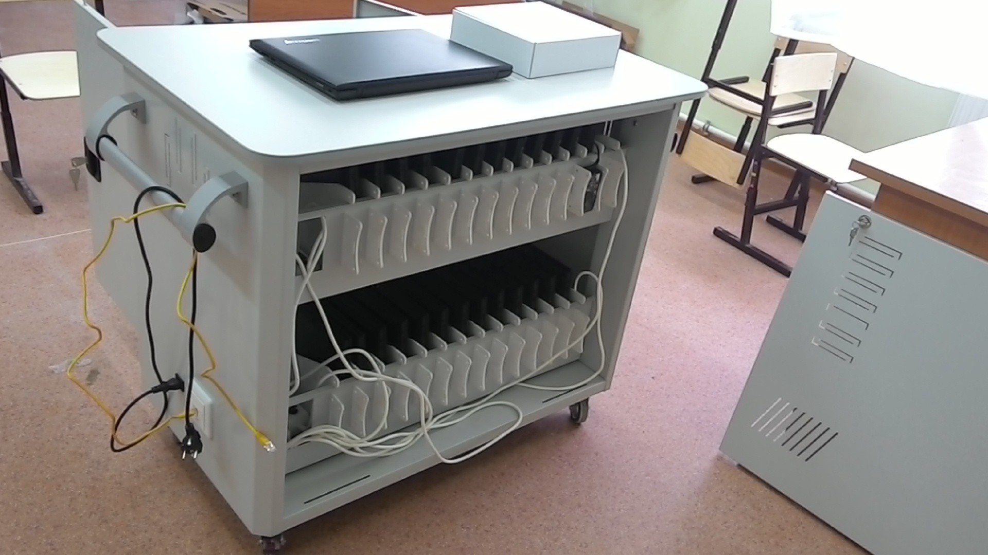 Мобильный класс – это передвижная тележка-сейф, в которой хранятся персональные ноутбуки для учеников. Бокс предоставляет возможность не только хранения компьютерной техники: Прелесть укомплектованного бокса в его мобильности – развернуть компьютерную ученическую сеть можно в любой момент урока – это не займет много времени. Тележка сделана из прочных, но легких полимеров, с ее передвижениями справится и учитель, и ученики.