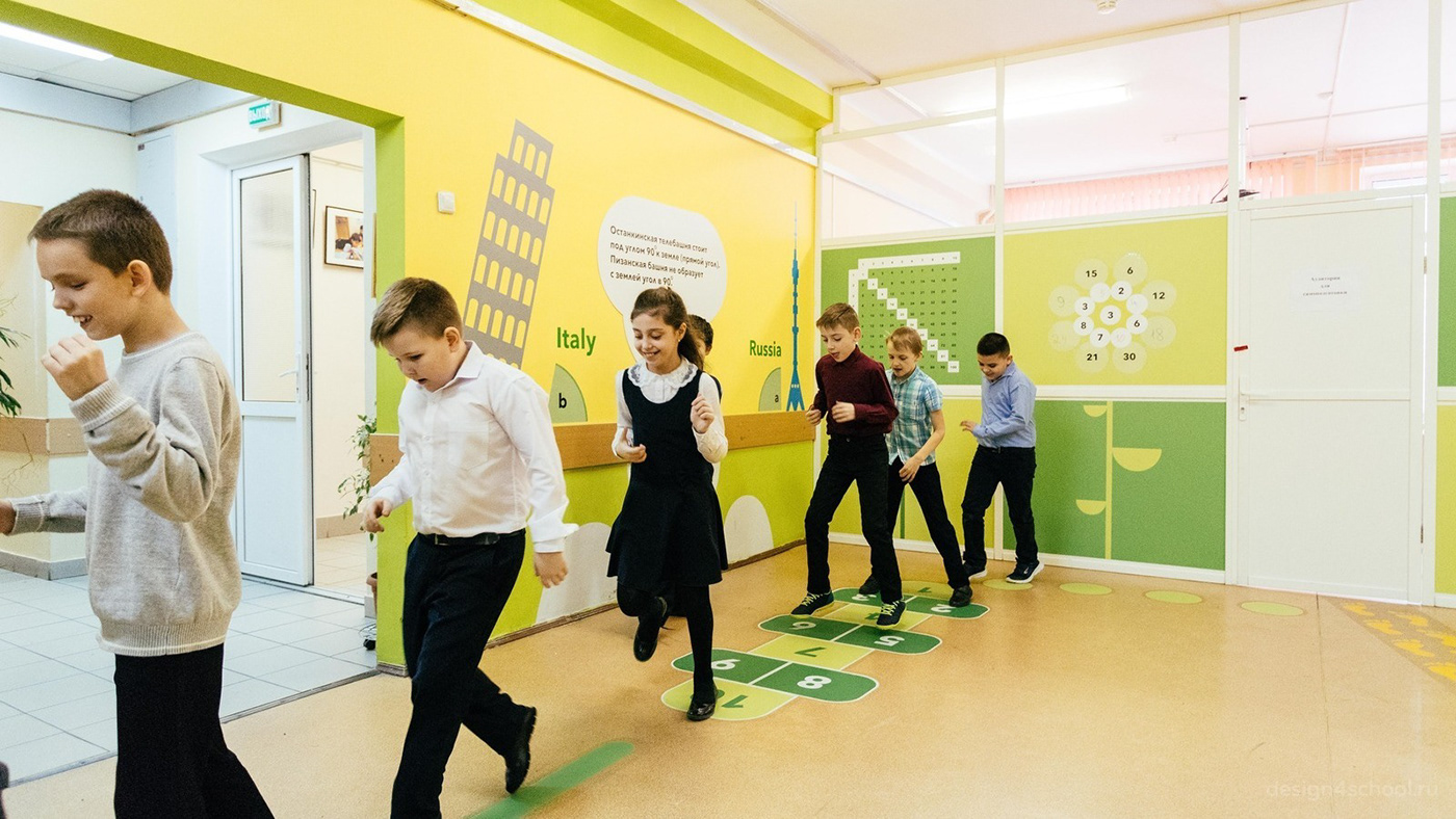 Лучший способ отдохнуть — это сменить вид деятельности, поэтому на перемене школьники охотно играют в подвижные игры. Мы рекомендуем размещать в рекреационных пространствах различные игровые модули, чтобы удовлетворить потребность детей в движении. Превратить рекреацию в игровую площадку можно при любом бюджете, даже минимальном: для этого достаточно нанести на пол/стены изображения с различными игры типа классиков, догонялок, балансиров.
